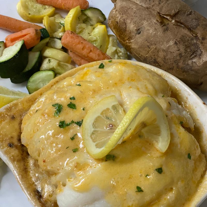 Shrimp, Scallops, & Haddock cooked in lemon butter and wine, topped with seasoned bread crumbs.